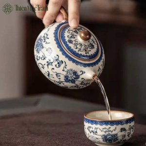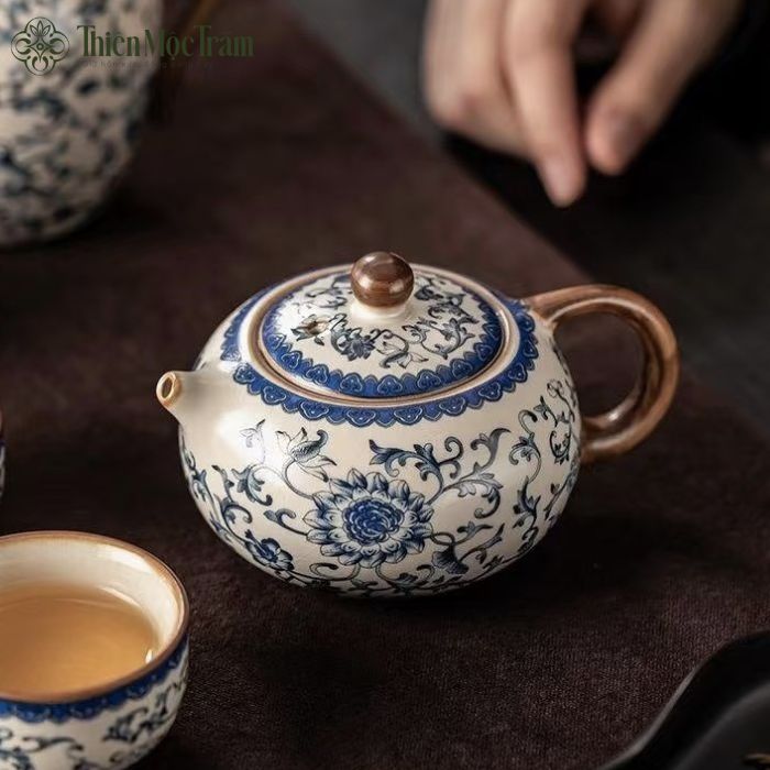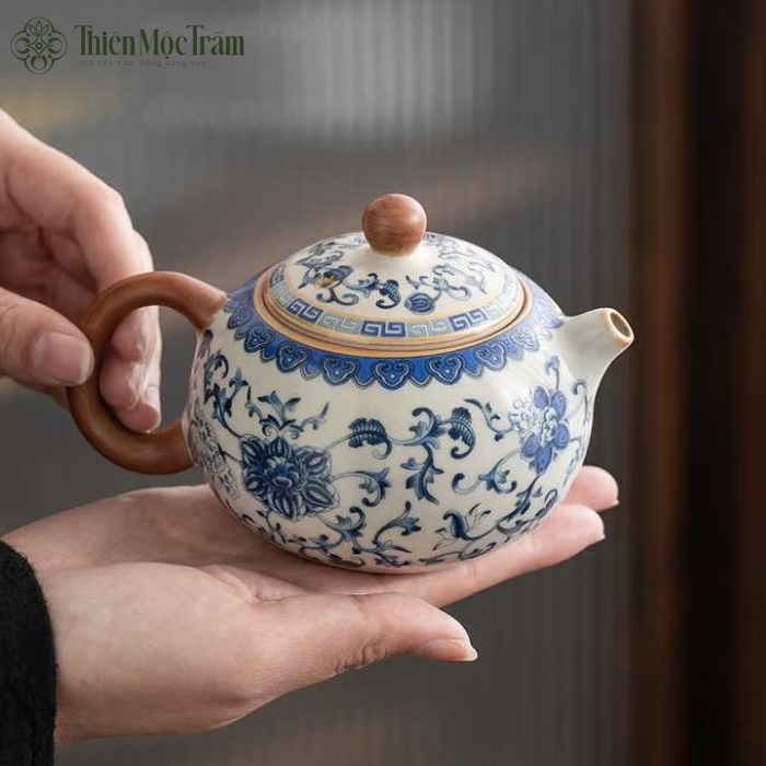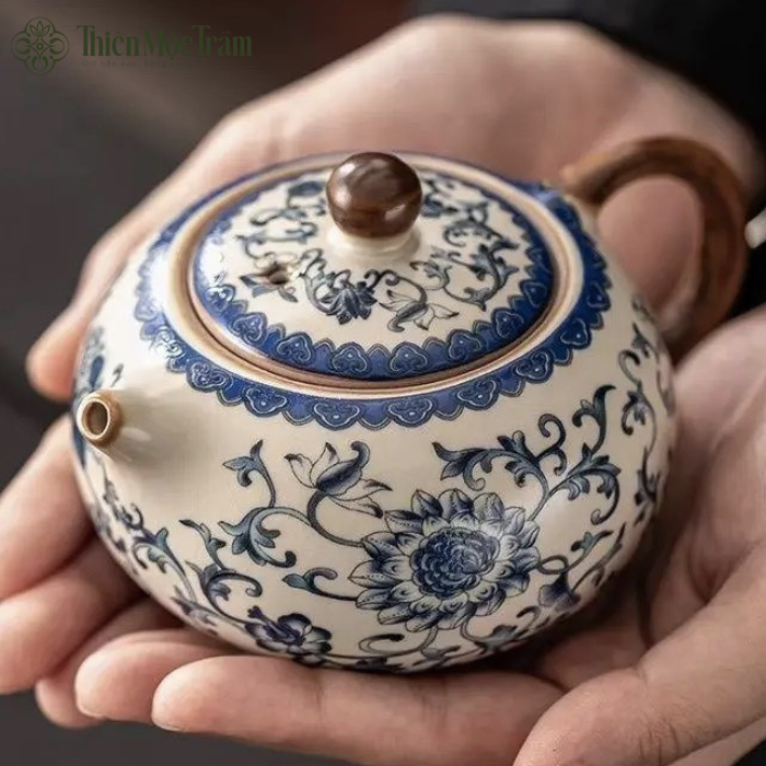 Ấm Trà Gốm Lam Cổ là sự kết hợp tinh tế giữa nghệ thuật gốm thủ công truyền thống và tinh thần trà đạo hiện đại. Thân ấm được chế tác từ gốm sứ cao cấp nung ở nhiệt độ cao, phủ men trắng ngà và vẽ tay họa tiết hoa lam cổ điển mang đậm nét Á Đông.