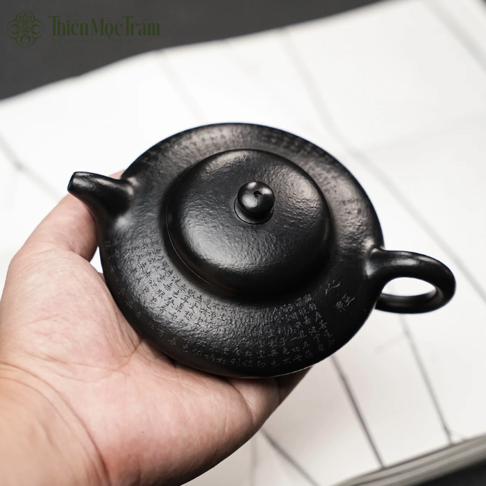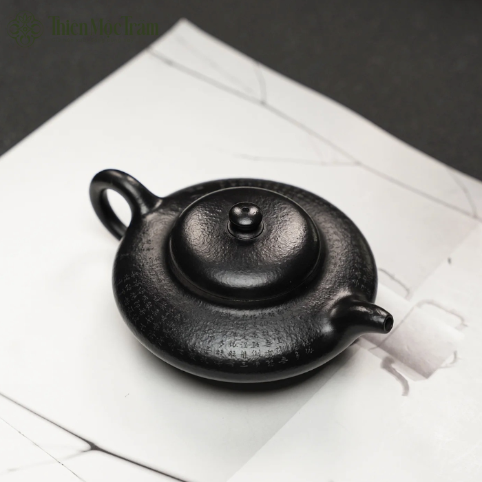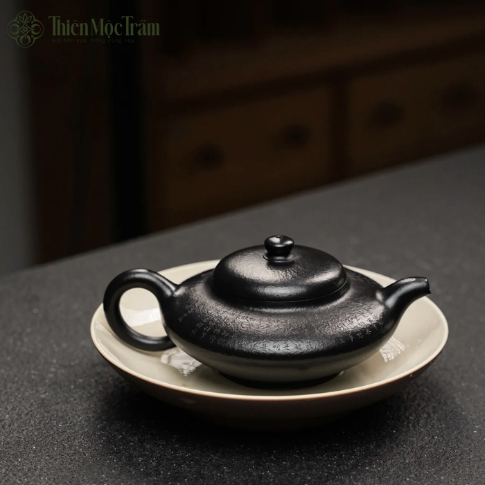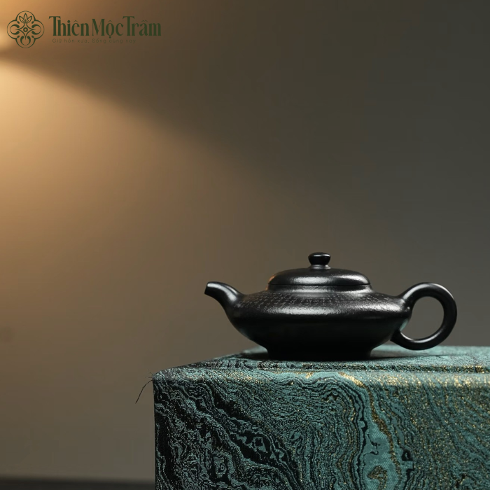 Tử Sa Huyền Ngọc có dáng ấm thấp, tròn đều, nắp phẳng biểu trưng cho sự tĩnh tại và cân bằng nội tâm. Sắc đen huyền ánh ngọc của bề mặt gốm mang đến vẻ đẹp trầm mặc, sang trọng – tựa viên ngọc đen ẩn mình giữa không gian thiền định.