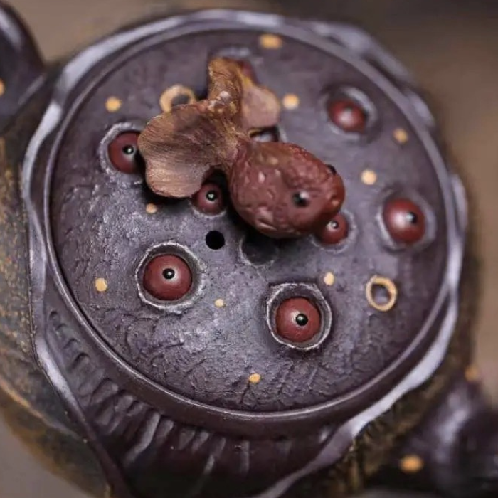 Thiết kế ấm mô phỏng hình lá sen úa cuộn quanh thân, tượng trưng cho vòng tuần hoàn tự nhiên – sinh diệt hòa hợp, biểu hiện của triết lý “tâm tĩnh giữa biến đổi”. Trên nắp ấm, nghệ nhân tỉ mỉ nặn ốc sen và hạt sen khô, điểm nhấn độc đáo, vừa sinh động vừa mang ý nghĩa thanh tịnh – tái sinh – viên mãn.