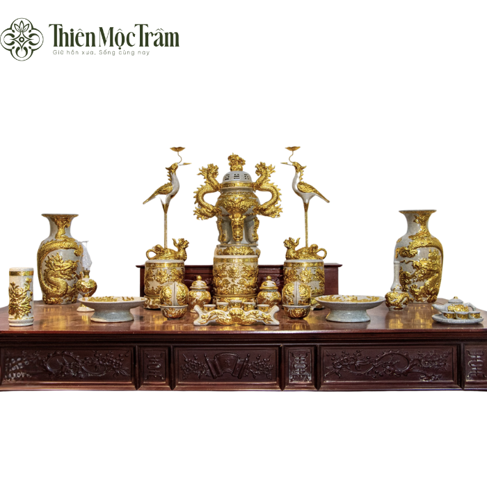 Bộ ban từ đường men rạn dát vàng thuộc dòng sản phẩm thờ cúng cao cấp nhất của Bát Tràng. Từng chi tiết được chế tác thủ công, họa tiết Rồng – Phụng – Hoa Sen được đắp nổi và dát vàng 24K, tạo nên vẻ đẹp quyền quý, trường tồn cùng thời gian.