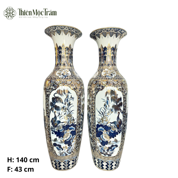 Lộc Bình Bát Tràng cao 140 cm là dòng sản phẩm cao cấp, nổi bật với nghệ thuật vẽ tay men lam cổ, kết hợp đắp nổi và điểm vàng kim đầy sang trọng. Họa tiết tùng – hạc – hoa điểu biểu trưng cho trường thọ, thanh cao, phú quý và bình an, phù hợp trưng bày trong các không gian lớn.
