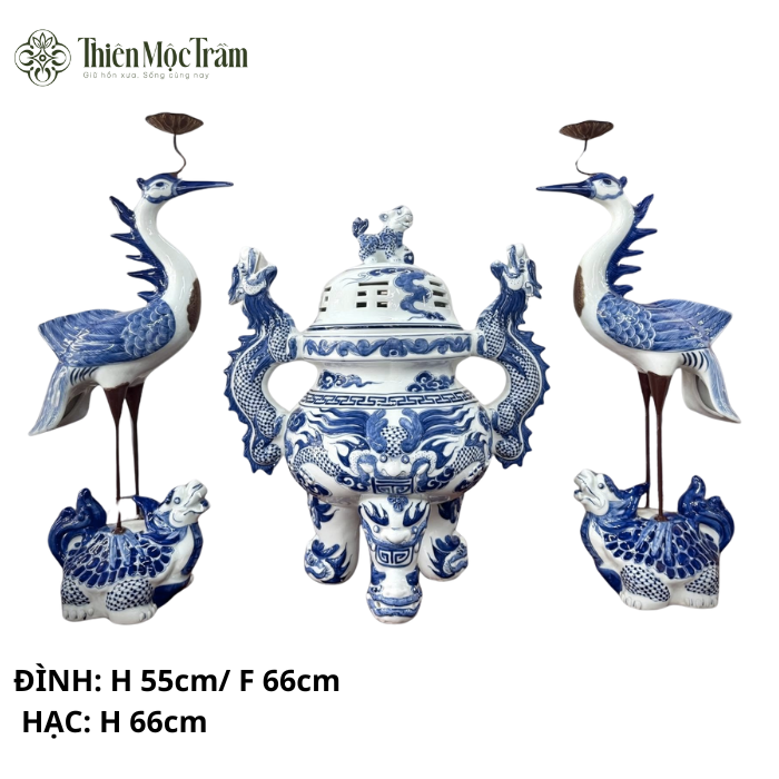 Bộ đồ thờ cúng men lam gồm đỉnh hương 3 chân chạm rồng và đôi hạc cưỡi rùa – biểu tượng thiêng liêng trong văn hóa Việt. Từng chi tiết được nghệ nhân Bát Tràng vẽ tay bằng men lam cổ, tạo nên sắc xanh trầm ấm, bền màu và đậm chất truyền thống.