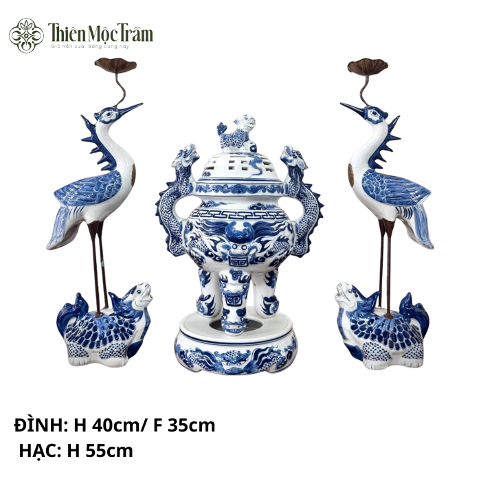 Bộ đỉnh – hạc thờ men lam Bát Tràng là một trong những dòng sản phẩm thờ cúng được ưa chuộng nhờ vẻ đẹp cổ kính, trang trọng và độ bền vượt thời gian. Từng chi tiết đều được nghệ nhân tạo hình tỉ mỉ: