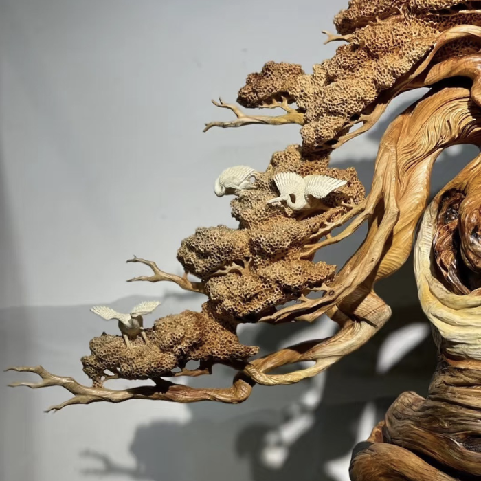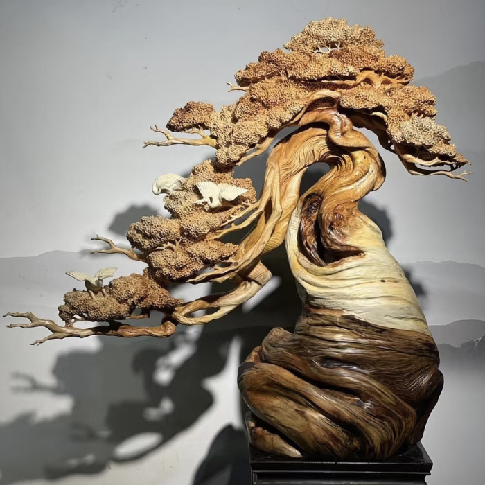 Thân cây được giữ nguyên dáng xoắn tự nhiên, tạo cảm giác mạnh mẽ nhưng mềm mại, thể hiện sức sống bền bỉ trước mọi thử thách. Tán tùng được đục thủ công tinh xảo với vô số chi tiết nhỏ, mô phỏng độ xốp – độ tơi của lá tùng một cách sống động đến mức như có thể lay động theo gió.