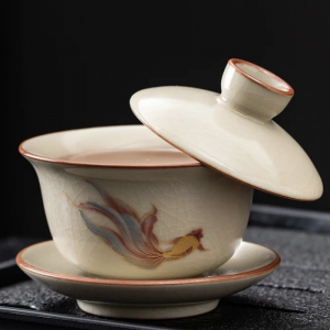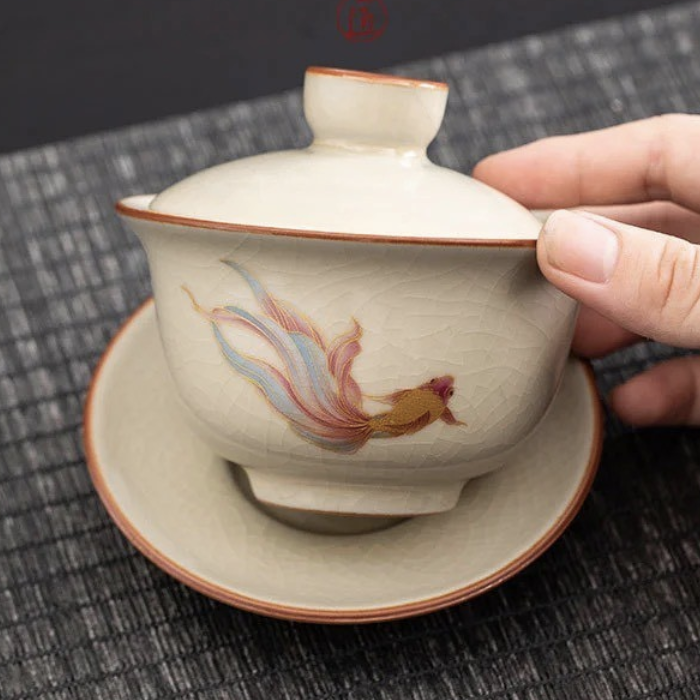 Chén được chế tác bằng gốm cao cấp nung ở nhiệt độ cao, phủ men ngọc thanh ngà pha rạn tự nhiên, cho bề mặt mịn như da ngọc, nhẹ mà chắc tay. Họa tiết cá vàng bơi lượn vẽ tay biểu trưng cho sự thuận hòa, dư dả và bình an – đồng thời mang ý nghĩa tâm linh “ngư du thủy trung, tâm an tĩnh tại”.