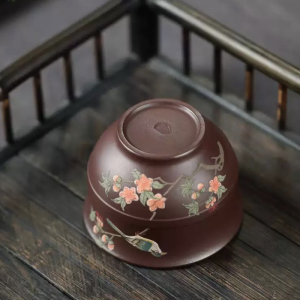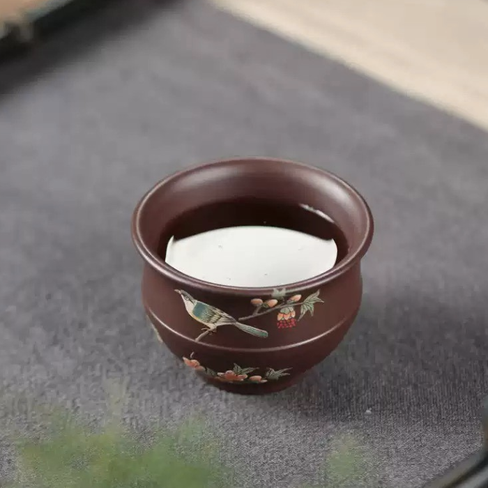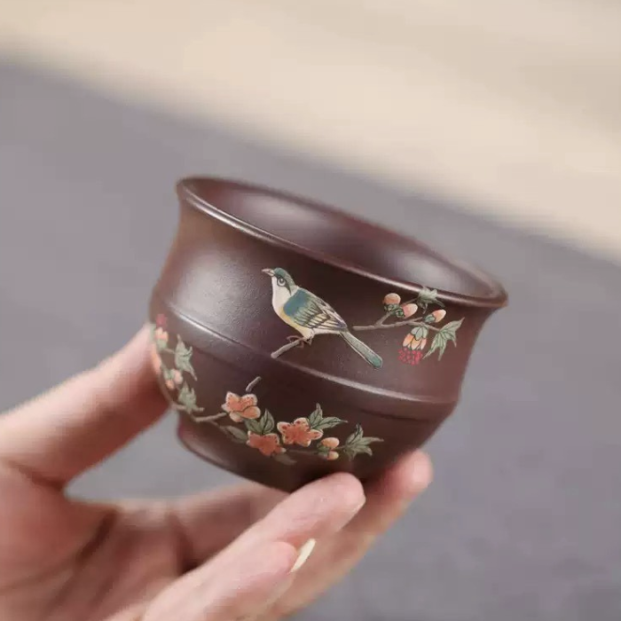 Chén Tử Sa Họa Điểu được chế tác từ đất tử sa nguyên khoáng, vẽ tay họa tiết chim đậu cành hoa tượng trưng cho mùa xuân và sự an nhiên. Từng nét vẽ thủ công tinh tế trên nền nâu trầm tạo nên vẻ đẹp trang nhã, mang phong vị thiền và tinh thần thưởng trà thanh tịnh.