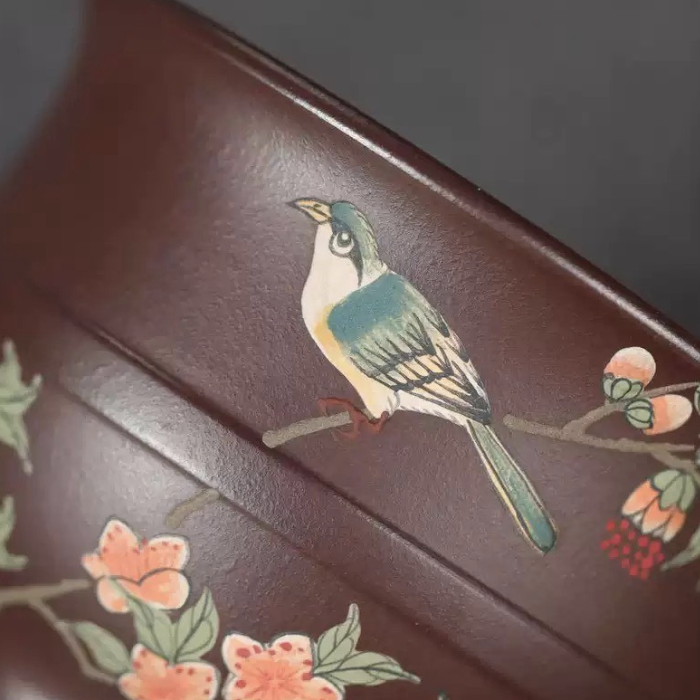 Trên nền nâu tím mộc mạc, nghệ nhân vẽ tay họa tiết chim đậu cành hoa đỏ cam, tượng trưng cho sắc xuân và sự thanh nhàn trong tâm hồn. Mỗi đường cọ uyển chuyển, mỗi bông hoa nhỏ đều được hoàn thiện bằng tay, thể hiện tinh thần “nhất bút nhất tâm” – mỗi nét vẽ là một hơi thở thiền. Dáng chén loe nhẹ, thân rộng, lòng sâu vừa phải giúp giữ hương trà lâu, dễ cảm nhận sắc – vị – khí của từng loại trà.
