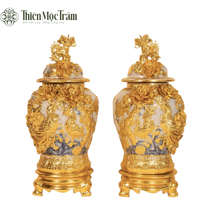 Choé được chế tác từ gốm Bát Tràng cao cấp, tạo hình dáng bầu truyền thống, thân nổi hoa văn công – mẫu đơn hoàn toàn thủ công. Toàn bộ họa tiết được phủ vàng kim, tạo hiệu ứng lấp lánh, sang trọng và đẳng cấp hàng đầu trong dòng đồ gốm thờ – trưng phong thủy.