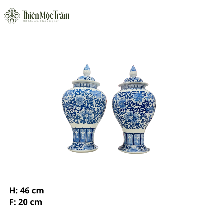 Đôi choé men lam được chế tác theo đúng kỹ thuật gốm truyền thống Bát Tràng, nổi bật với lớp men lam cổ và hoa văn vẽ tay hoàn toàn bởi nghệ nhân lâu năm. Dáng choé thắt eo – phình bụng – miệng loe giúp tổng thể hài hòa, sang trọng và chuẩn phong thủy.