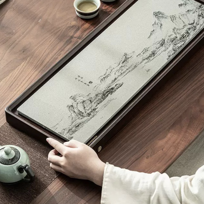 Được chế tác từ đá tự nhiên nguyên khối, khay có độ bền cao, khả năng chống nước và giữ nhiệt ổn định, mang lại cảm giác mát lành và vững chãi khi đặt tay pha trà.
