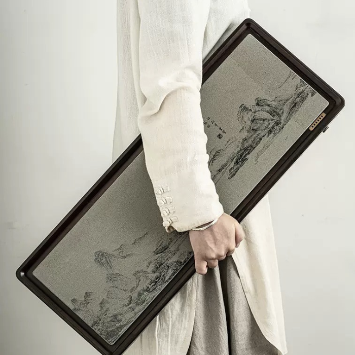 Bề mặt khay được khắc họa tiết sơn thủy thủ công, lấy cảm hứng từ cảnh “núi non mây nước” – biểu tượng của sự thanh tịnh, hòa hợp và cân bằng trong tâm. Mỗi đường khắc, mỗi vân đá đều khác biệt, tạo nên tác phẩm độc bản – không có chiếc thứ hai giống hệt.