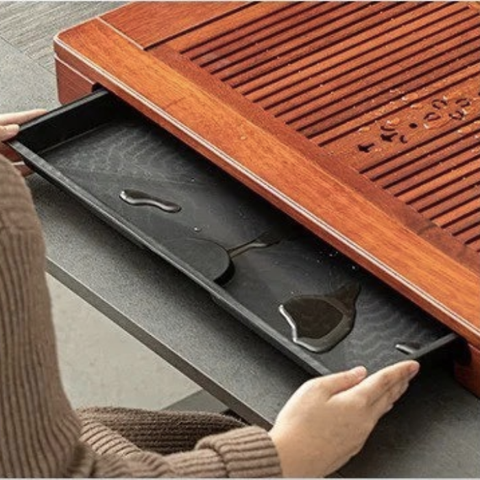 Bề mặt khay được thiết kế rãnh thoát nước song song cùng hoa văn khắc tinh tế ở trung tâm, vừa tạo điểm nhấn thẩm mỹ, vừa giúp nước thoát nhanh và giữ cho khay luôn khô thoáng khi thưởng trà.