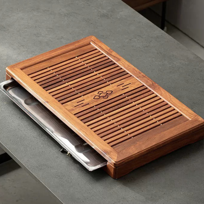 Khay Trà Gỗ Cẩm Lai – Dáng Trường Phong được chế tác thủ công từ gỗ Cẩm Lai tự nhiên nguyên khối, nổi bật với sắc gỗ nâu ánh đỏ sang trọng, vân gỗ uyển chuyển và thiết kế rãnh thoát nước tinh tế. Kết hợp khay hứng inox ẩn bên dưới, mang đến vẻ đẹp thanh nhã và tiện dụng trong từng nghi thức trà đạo.
