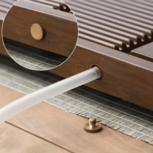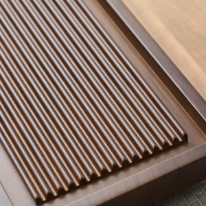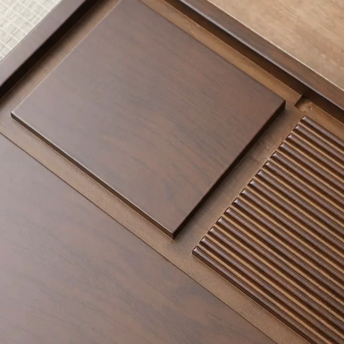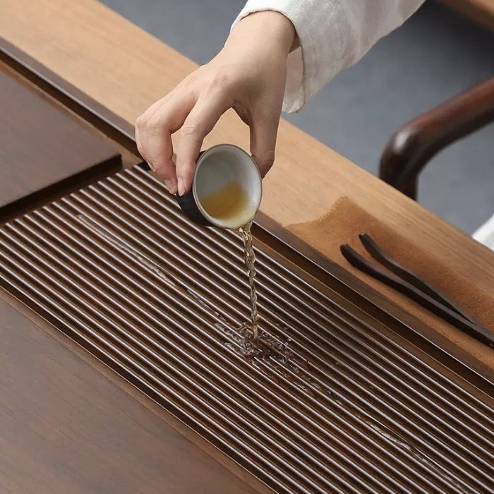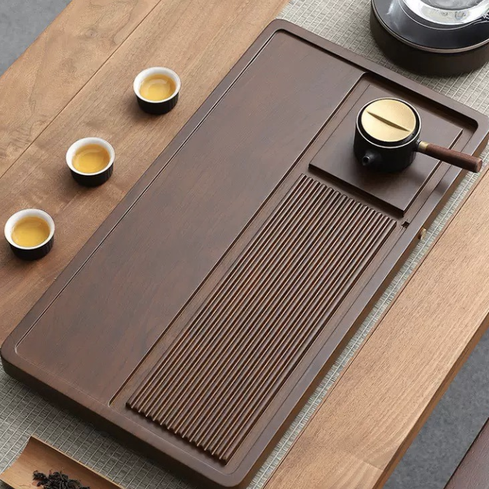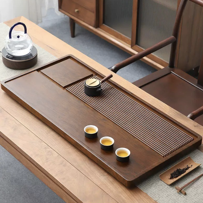 Thiết kế khay gồm 2 khu vực riêng biệt – mặt phẳng để ấm chén và phần rãnh thoát nước song song – tạo sự tiện dụng khi rót trà, giúp nước được dẫn gọn gàng, giữ bàn trà luôn khô ráo và tinh tươm.