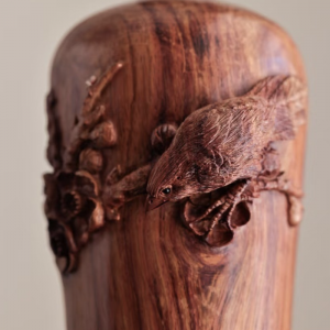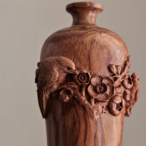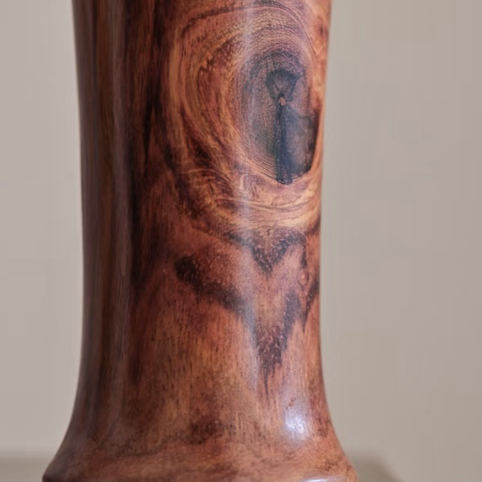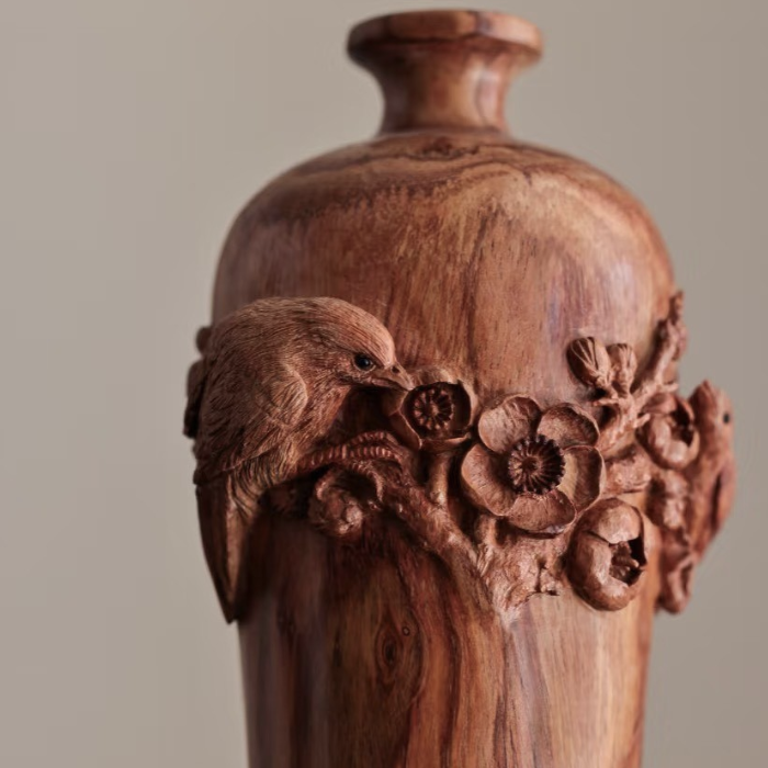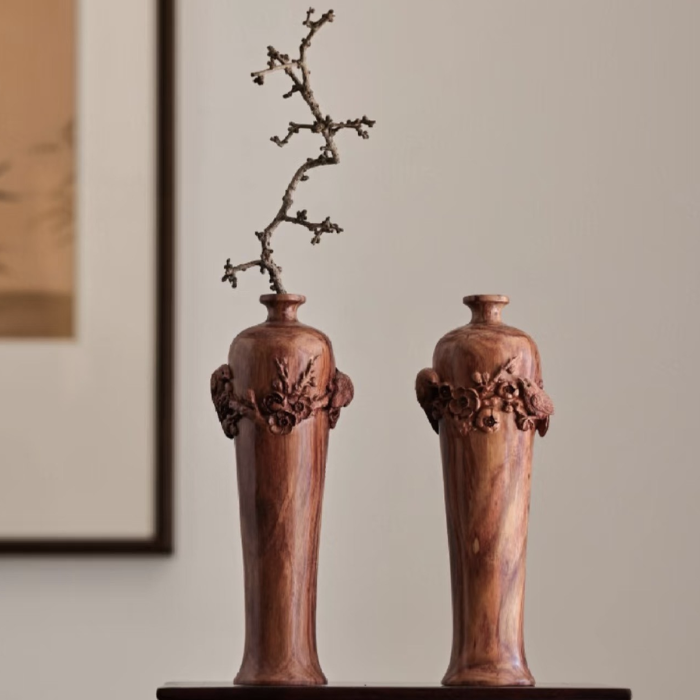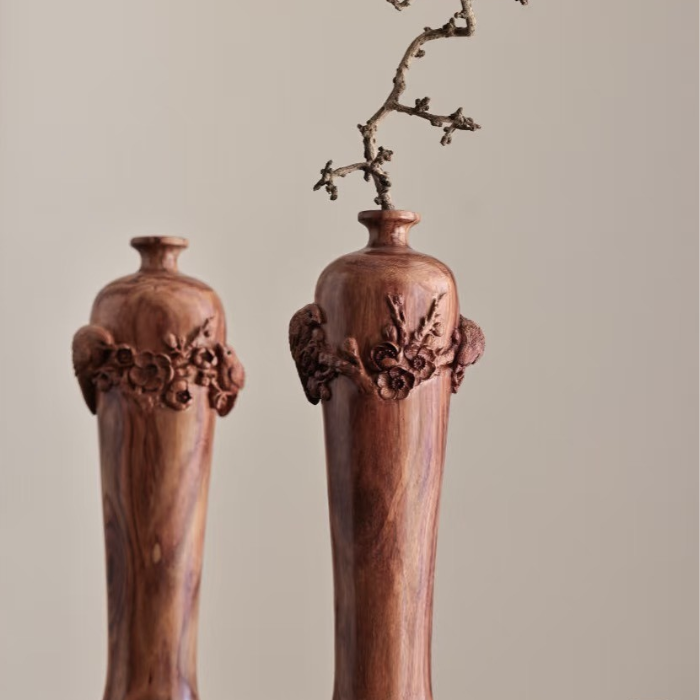 Đôi lục bình gỗ mỹ nghệ được chế tác thủ công từ gỗ tự nhiên quý hiếm, với sắc nâu trầm ấm và vân gỗ mềm mại, uyển chuyển như sóng nước. Phần thân bình được tạo dáng cao thanh thoát, kết hợp chi tiết hoa mai chạm nổi quanh cổ bình – tượng trưng cho phúc lộc, trường thọ và khí vận hanh thông.
