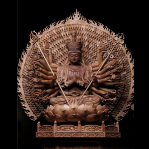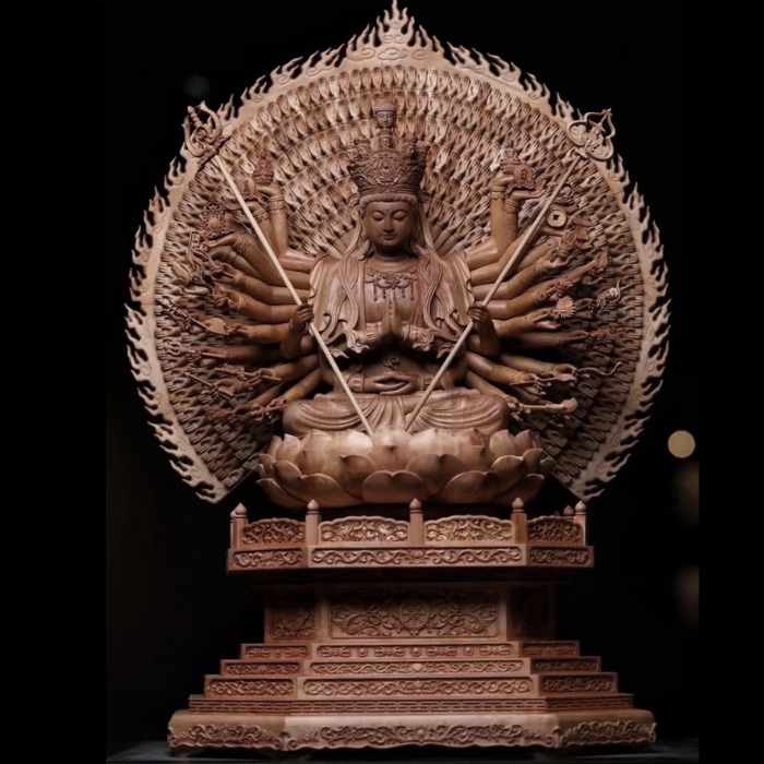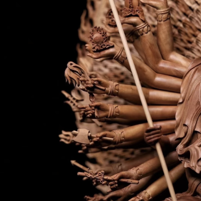 • Điêu khắc Tinh xảo: Tác phẩm nổi bật với sự công phu trong việc chế tác hàng trăm cánh tay xếp thành vòm hào quang (Phật Quang) phía sau. Mỗi cánh tay và pháp khí đều được chạm khắc chi tiết, tạo ra sự sống động và uy lực.