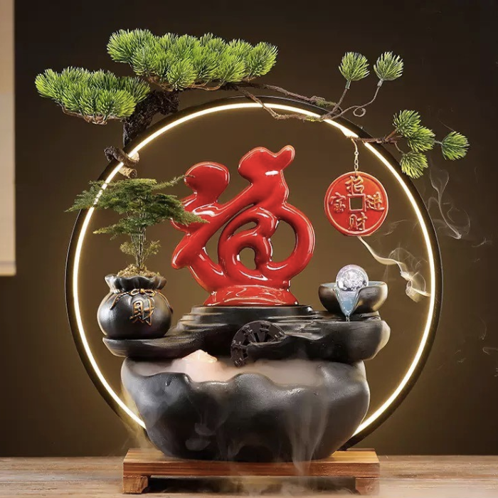 Thác Nước Tiểu Cảnh Chữ Phúc Ngũ Phúc Lâm Môn được thiết kế dựa trên nguyên tắc phong thủy về sự viên mãn và thịnh vượng. Trung tâm tiểu cảnh là chữ Phúc lớn màu đỏ, tượng trưng cho phú quý, may mắn và gia đạo hưng thịnh. Bên cạnh là bình tài lộc, đồng xu cổ và tiểu cảnh cây tùng mang ý nghĩa trường thọ, vững bền và thu hút tài khí.
