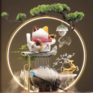 Thác Nước Tiểu Cảnh Mèo Phú Quý là sản phẩm trang trí phong thủy được thiết kế theo phong cách hiện đại kết hợp yếu tố truyền thống. Tượng Mèo Thần Tài Maneki Neko được đặt ở vị trí trung tâm, tượng trưng cho sự may mắn, tiền tài và vận khí hanh thông. Vòng đèn LED tròn bao quanh biểu trưng cho sự viên mãn, mang lại năng lượng cân bằng và hài hòa.