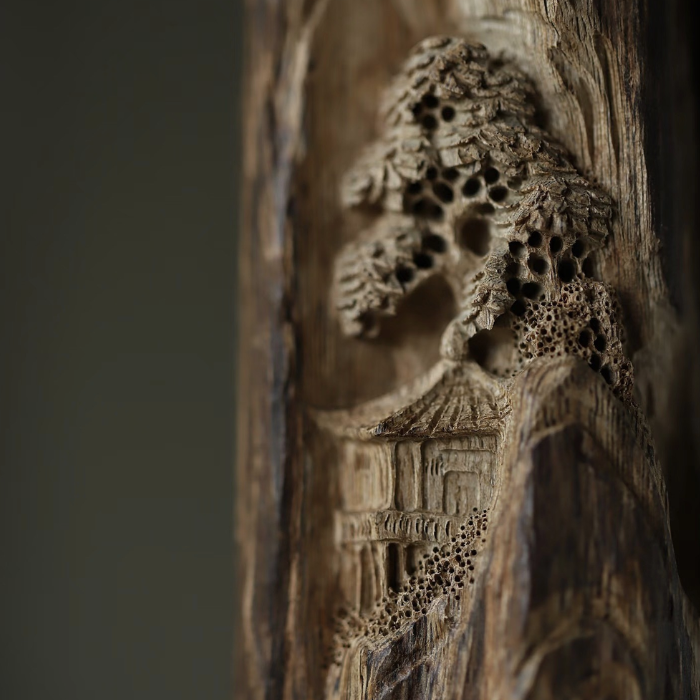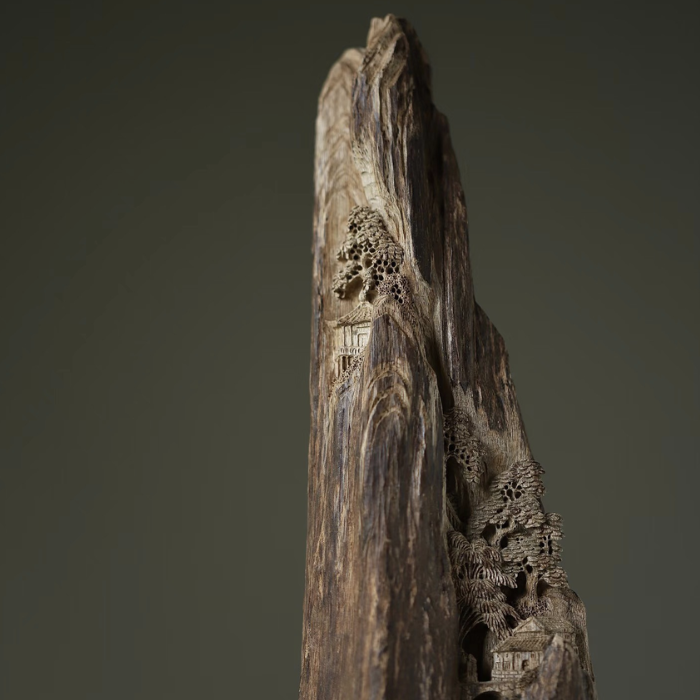 Tác phẩm được tạo hình từ khối trầm hương tự nhiên nguyên bản, giữ nguyên những đường nét thô mộc, hòa cùng bàn tay tinh xảo của nghệ nhân để chạm khắc thành khung cảnh sơn thủy hữu tình – mây vờn núi, nhà bên khe suối, cây tùng ẩn hiện.