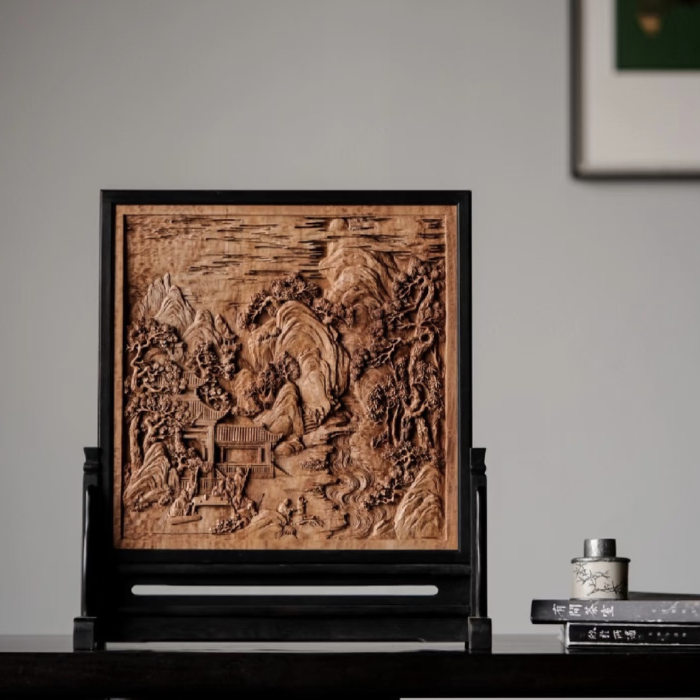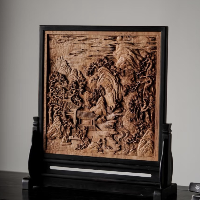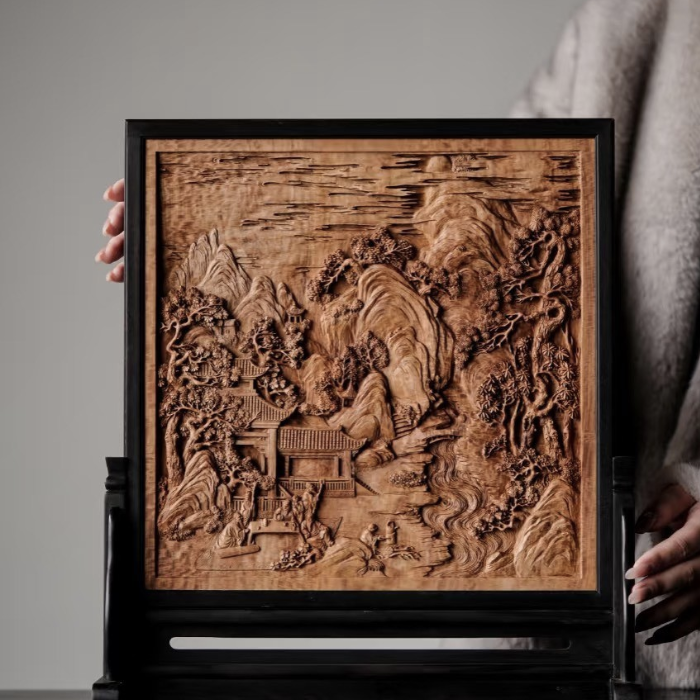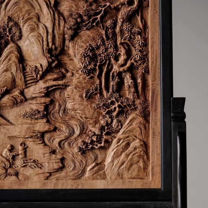 Toàn bộ bức tranh được chạm khắc thủ công, tạo nên chiều sâu đa lớp với từng chi tiết núi, cây, suối, nhà cổ và con người hiện lên sống động như một bức tranh phong cảnh thu nhỏ. Nghệ nhân sử dụng kỹ thuật đục nông – sâu kết hợp, giúp ánh sáng khi chiếu vào làm nổi bật từng đường nét, tạo hiệu ứng 3D rõ rệt.