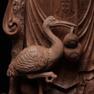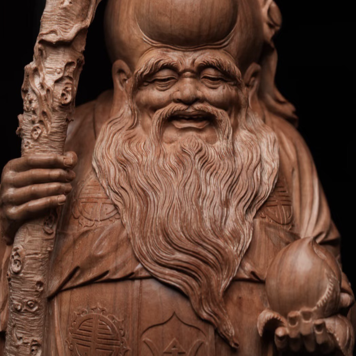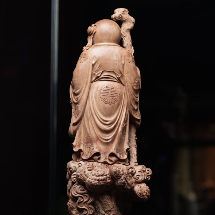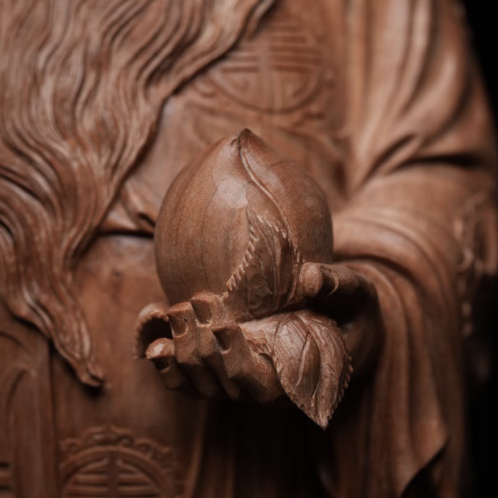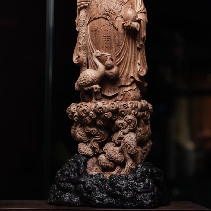 Tượng Ông Thọ được chế tác từ gỗ tự nhiên nguyên khối, với sắc gỗ trầm ấm và vân gỗ rõ nét, mang lại cảm giác vừa cổ điển vừa sang trọng. Hình tượng Ông Thọ được khắc họa tay cầm quả đào tiên, biểu trưng cho tuổi thọ, sức khỏe và hạnh phúc dài lâu, tay kia chống trượng trúc, bên cạnh là chim hạc – linh vật của sự thanh cao và bền vững.