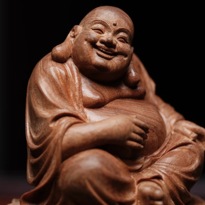 Tượng Phật Di Lặc mang thần thái hoan hỷ, nụ cười rộng rạng rỡ – biểu tượng của niềm vui và sự lạc quan. Tác phẩm được làm từ gỗ hương tự nhiên nguyên khối, vân đẹp, màu trầm ấm, bề mặt được nghệ nhân xử lý mịn, giữ lại nét mộc mạc thuần tự nhiên của gỗ.