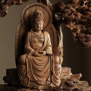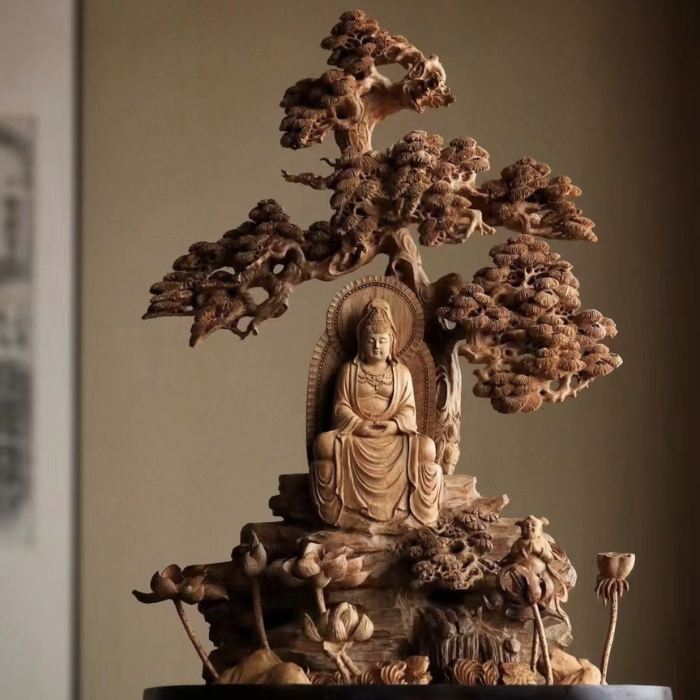 Tượng Quan Âm Ngự Sơn Tùng là một trong những tác phẩm mỹ nghệ mang chiều sâu tâm linh và giá trị nghệ thuật vượt bậc. Tượng được chế tác hoàn toàn thủ công từ gỗ tự nhiên (Linh muốn mình cập nhật chất liệu cụ thể thì nói mình thêm nhé), nổi bật với các lớp tán tùng – biểu tượng của sự trường thọ và kiên định. Bên dưới là đài sen, dòng nước và cảnh núi đá, tượng trưng cho sự thanh tịnh, vượt thoát khỏi phiền não.