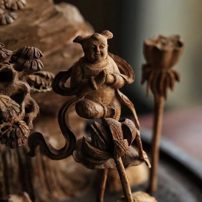 Bố cục tổng thể hài hòa phong thủy: Tùng – Sơn – Sen – Quan Âm kết hợp thành biểu tượng bảo hộ, thanh lọc và dẫn dắt trí tuệ.