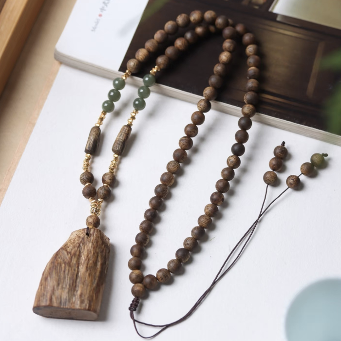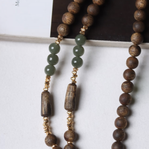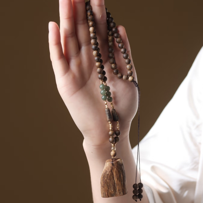 Từng hạt trầm được chọn lọc từ lõi gỗ trầm kiến rừng tự nhiên lâu năm, nơi nhựa trầm đã thấm sâu, tạo nên vân gỗ dày, tròn đều và hương thơm ấm ngọt đặc trưng. Mỗi chi tiết vàng 18K và ngọc thiên nhiên được gia công thủ công tỉ mỉ, không chỉ mang vẻ đẹp tinh xảo mà còn giúp cân bằng năng lượng và phong thủy.