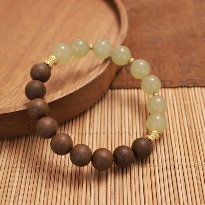 Chiếc vòng được phối từ hai chất liệu mang năng lượng tốt: Trầm hương tự nhiên – hạt tròn, mộc mạc, mùi thơm dịu ấm. Đá phong thủy – sắc xanh ngọc nhẹ, bề mặt bóng mịn, ánh sáng xuyên qua tạo cảm giác thanh thoát.